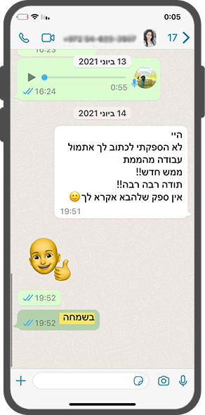 יש לנו ניסיון רב ומאות לקוחות מרוצים. מוזמנים לצפות בתכתובות מפרגנות, הקלטות שקיבלנו בווטסאפ של לקוחות שרצו להודות. נהניתם מהשירות? נשמח שתשלחו אלינו ונעלה לאתר או ולא פחות חשוב פרגון בגוגל.